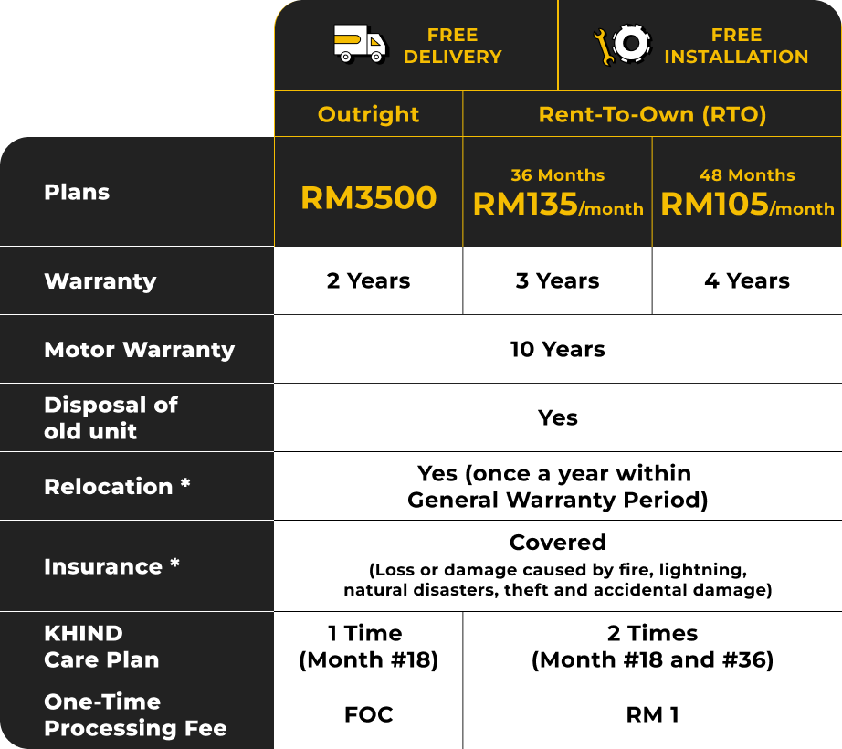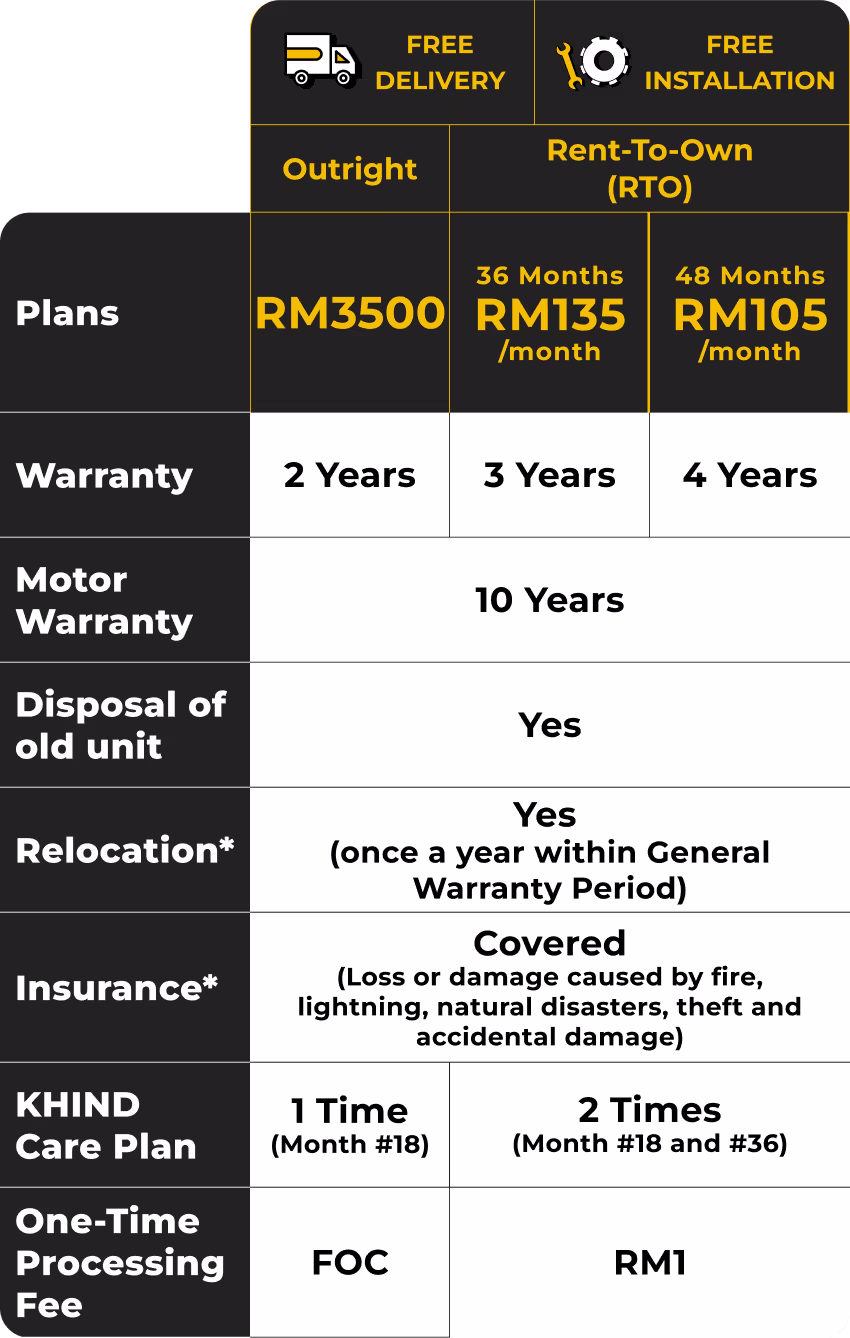 Dengan pelan Rent-to-Own, anda akan menerima servis KHIND Care Plan (KCP) setiap 18 bulan sekali mengikut tempoh langganan anda. Pasukan servis KHIND akan hubungi anda untuk tetapkan janji temu.